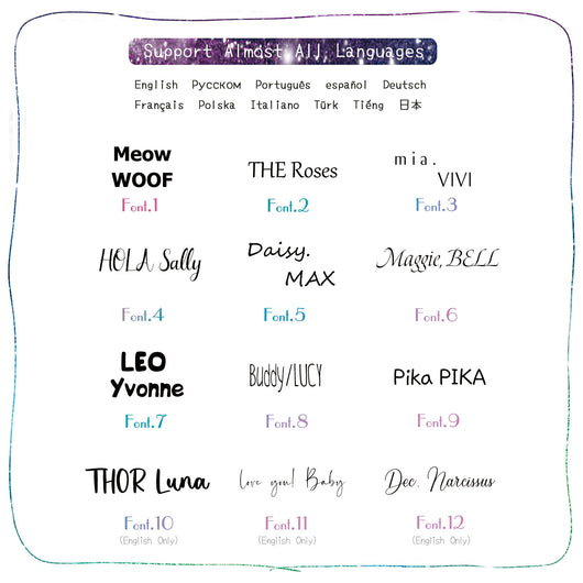 List and images for font style and symbol can be found on the images for this product gallery. Kindly check it for your reference